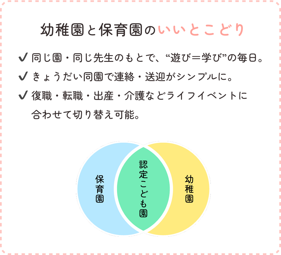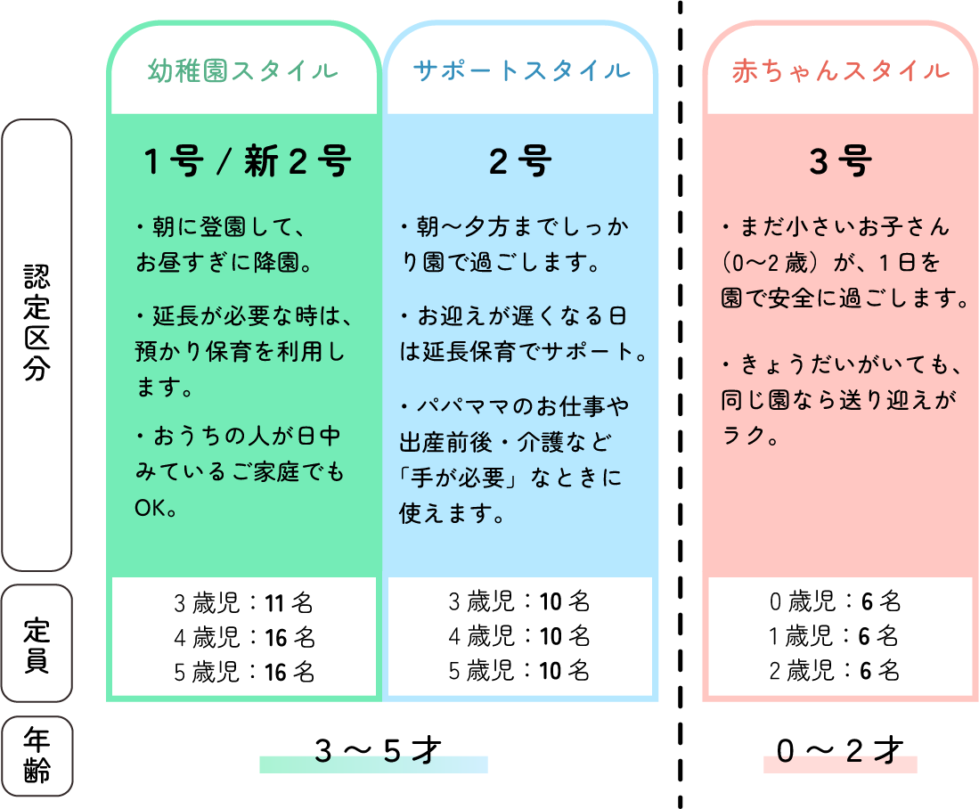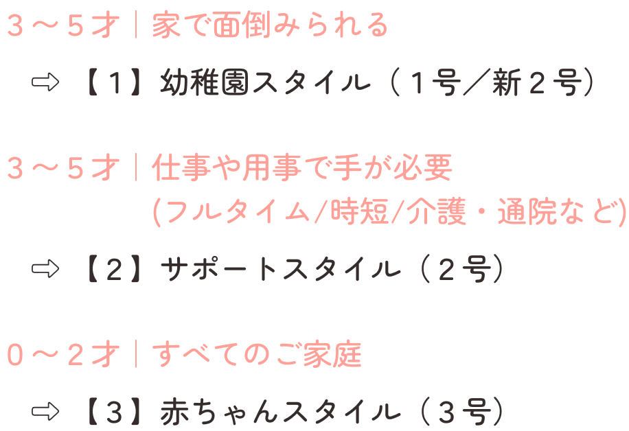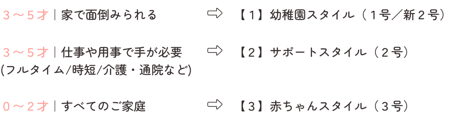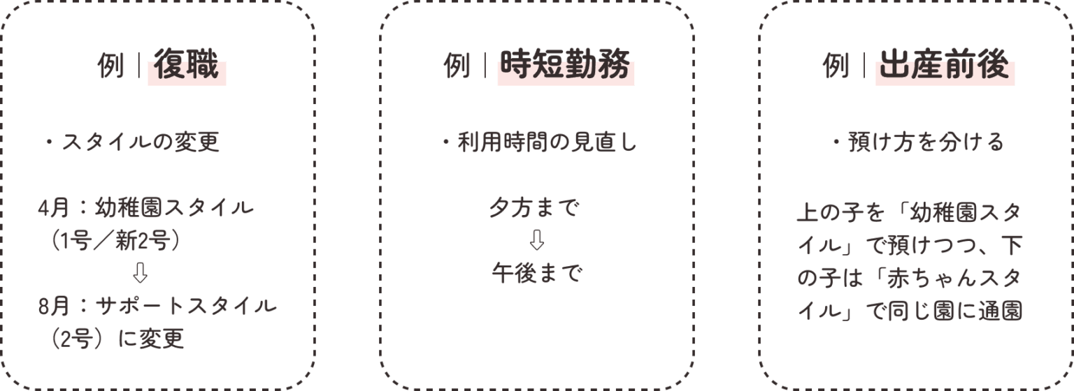 家族の暮らしが変わっても、転園せずに利用のしかたを切り替えられます。